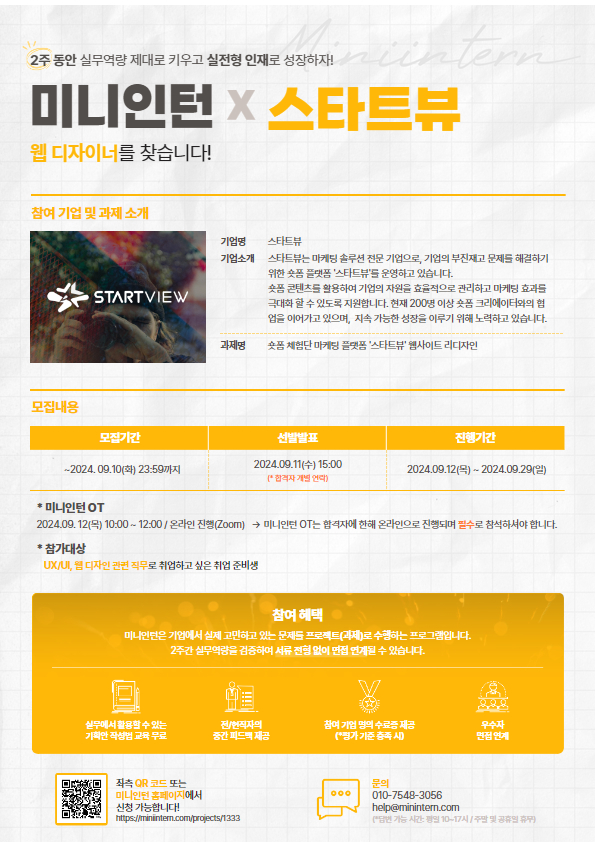 [미니인턴X스타트뷰] 숏폼 마케팅 플랫폼 ‘스타트뷰’의 UIUX 리디자인하고, 경쟁력 있는 포트폴리오까지 GET하세요! (~9/10)