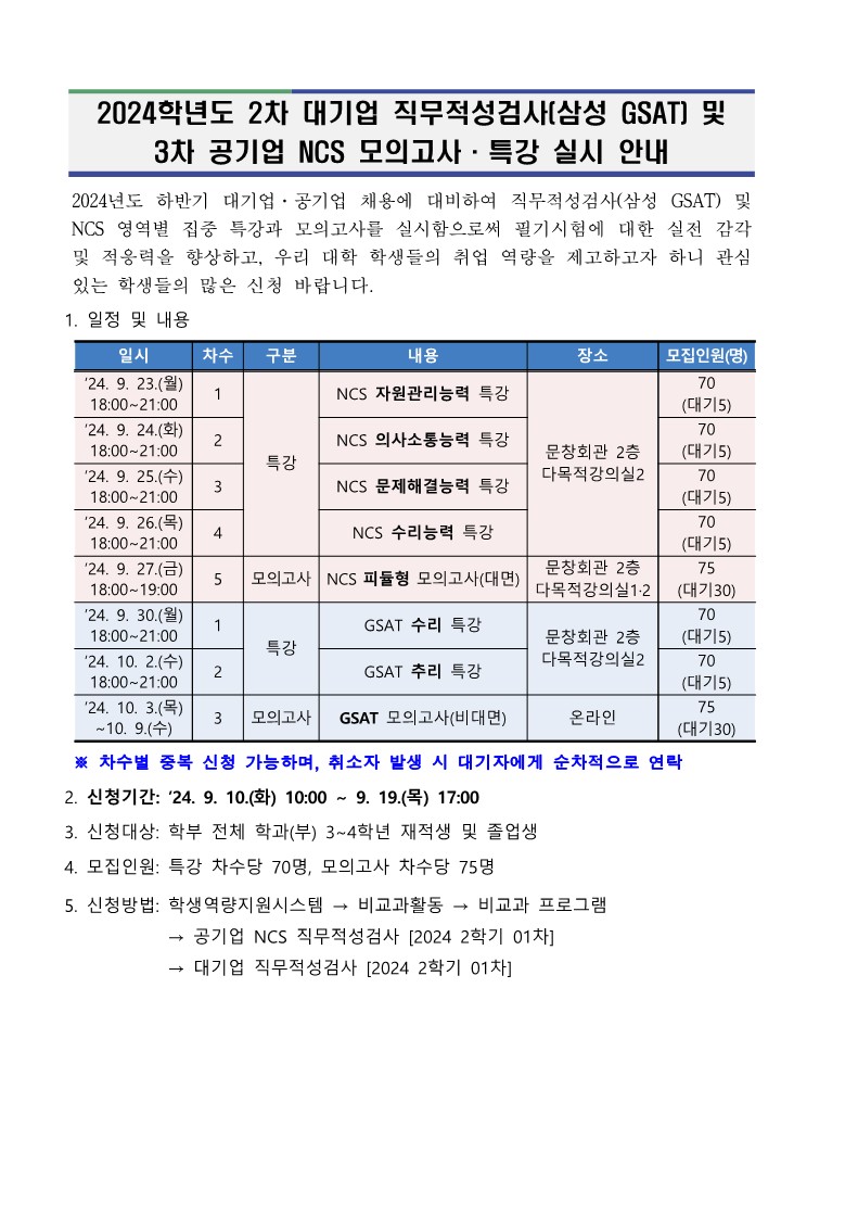 2024학년도 2차 대기업 직무적성검사(삼성 GSAT) 및 3차 공기업 NCS 모의고사·특강 실시 안내