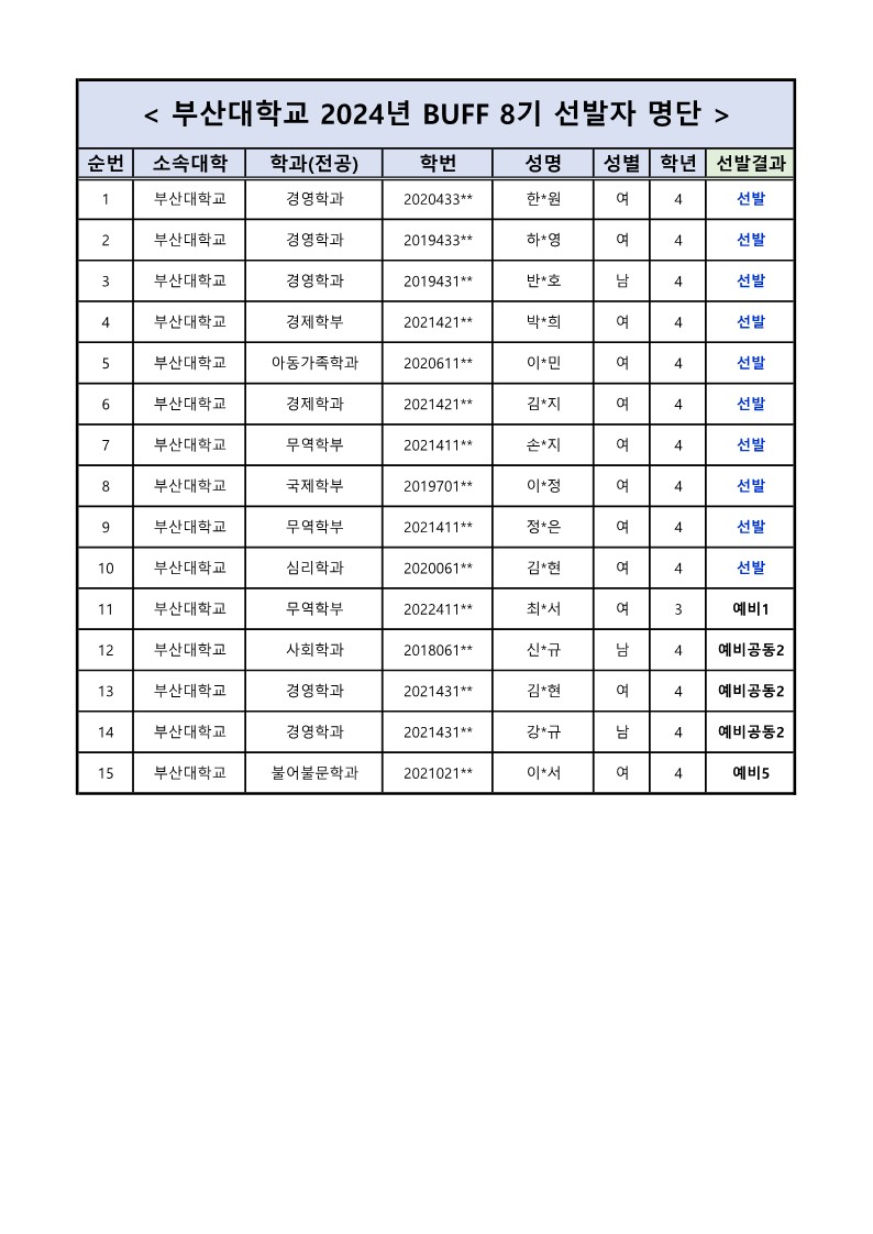 2024년 부산지역 대학생 역량강화 네트워크(BUFF) 8기 선발자(및 대기자) 명단을 아래와 같이 알려드립니다.