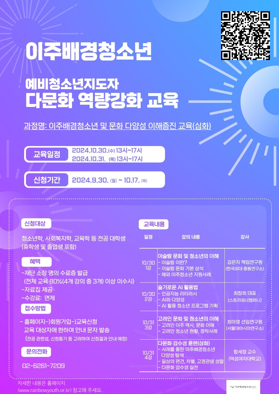 이주배경청소년지원재단은 예비청소년지도자(청소년학, 사회복지학, 교육학 관련 전공 대학생)의 다문화감수성 증진과 이주배경 실무 현장 이해를 위한‘다문화역량강화 온라인 교육과정’을 운영합니다.