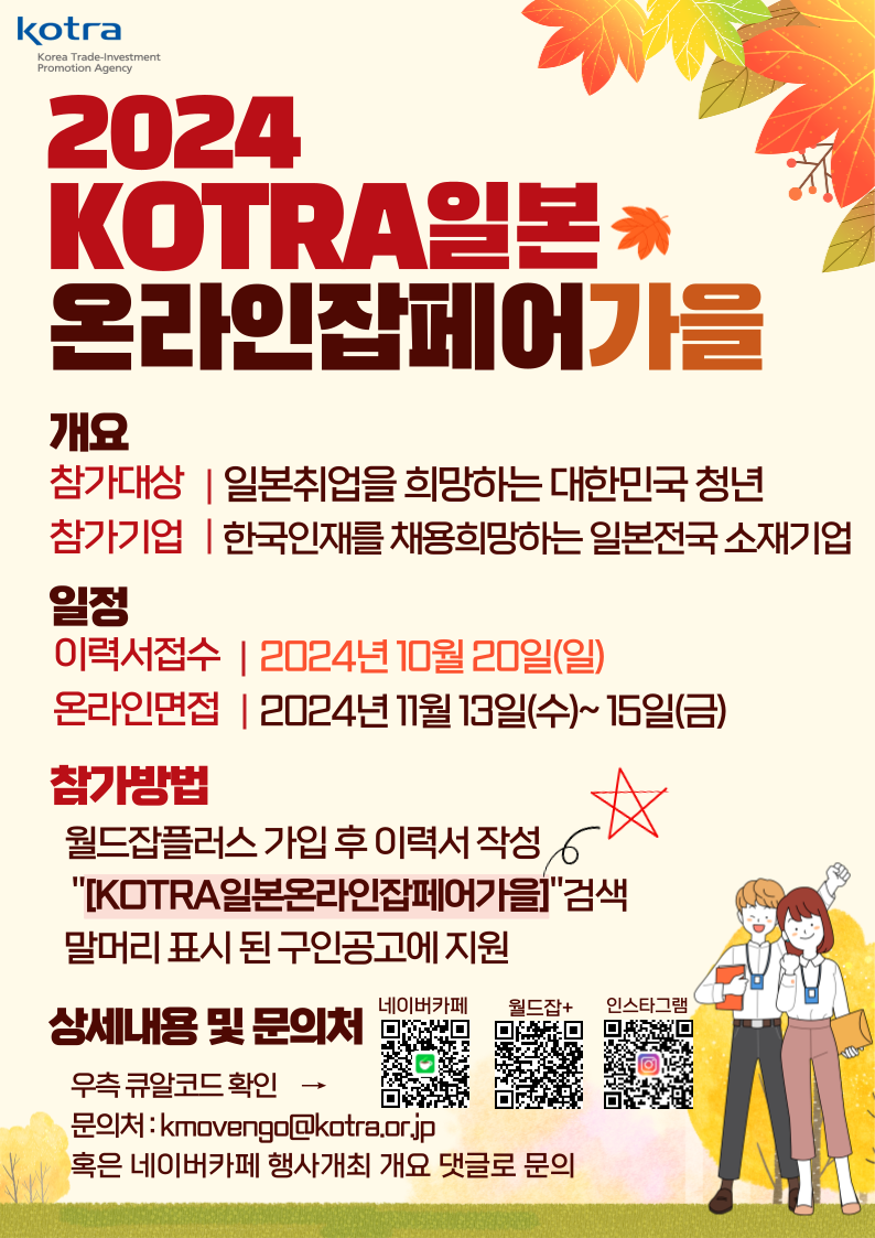 - l [2024KOTRA일본온라인잡페어가을] 부대행사&역량강화 세미나안내 : https://cafe.naver.com/kotratokyo/39494
