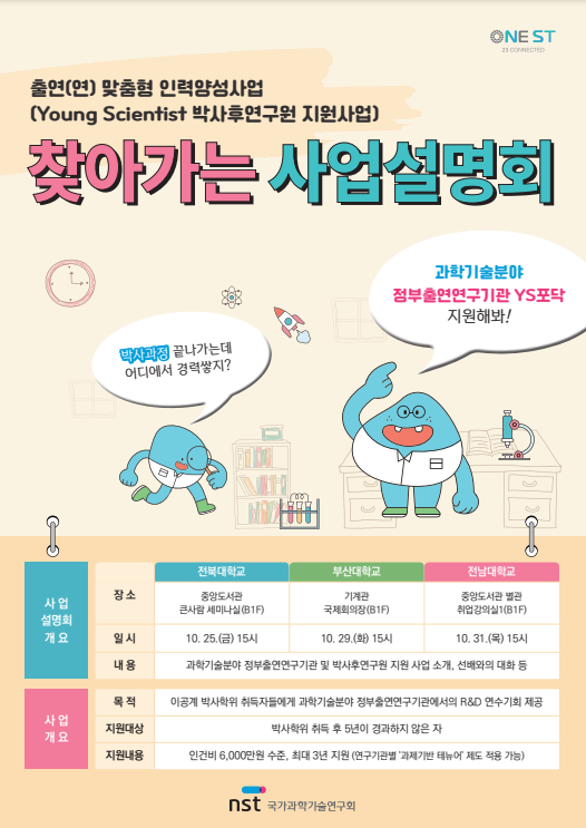 국가과학기술연구회 및 소관 정부출연연구기관 사업설명회 일정을 아래와 같이 알려드리니, 관심있는 학생들의 많은 참여 바랍니다.