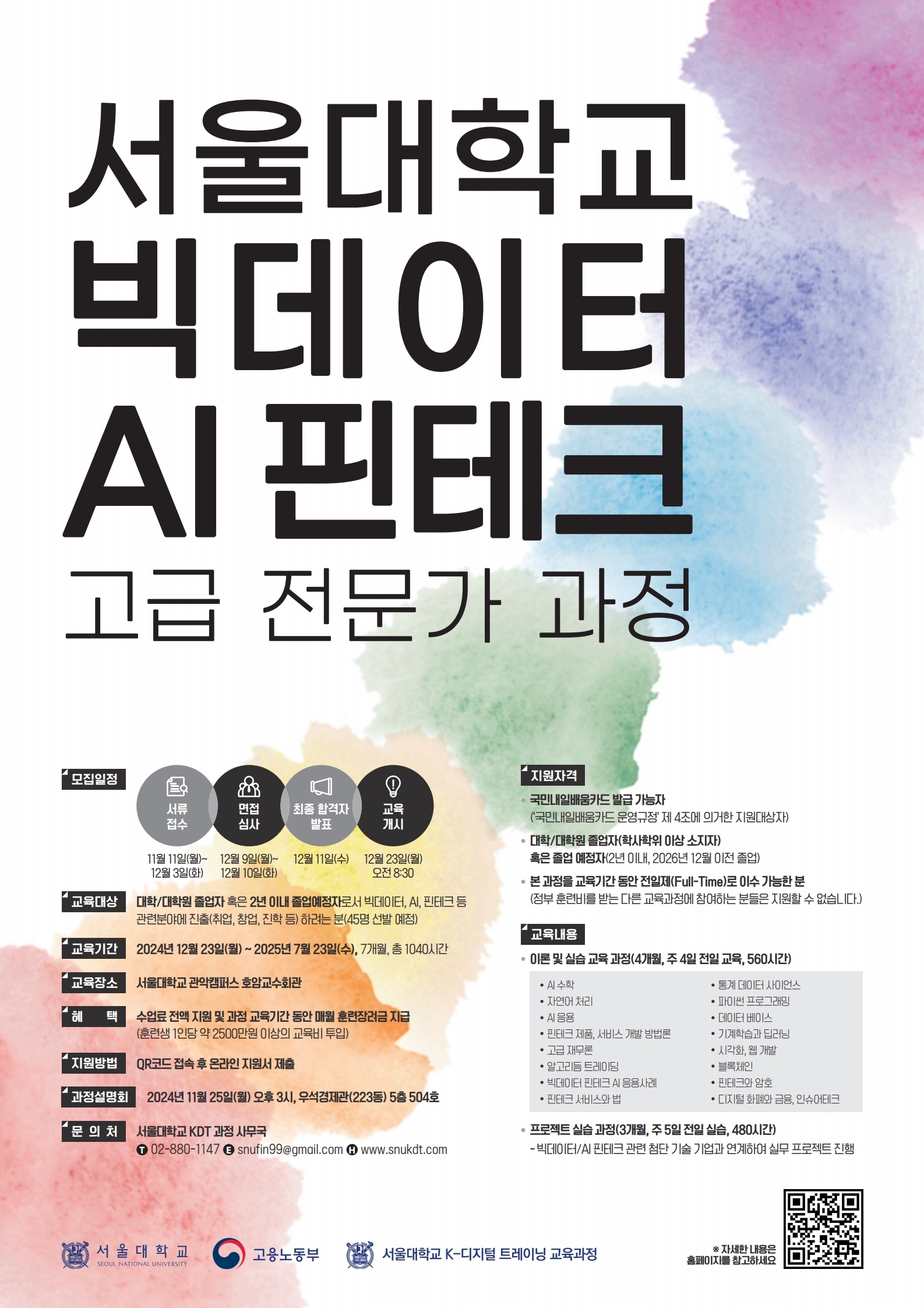 본 교육과정은 서울대학교가 주관하는 빅데이터 핀테크 AI 고급 전문가 양성 과정이자 고용노동부의 KDT사업으로 수업료 전액 지원되는 국비교육과정에 해당하며, 세계적인 4차 산업혁명의 파고속에서 선진적인 빅데이터 분석 능력을 갖추고 새로운 금융과 AI 산업의 변화를 앞장서서 이끌어갈 대한민국 대표 인재들을 양성하는 교육과정입니다.