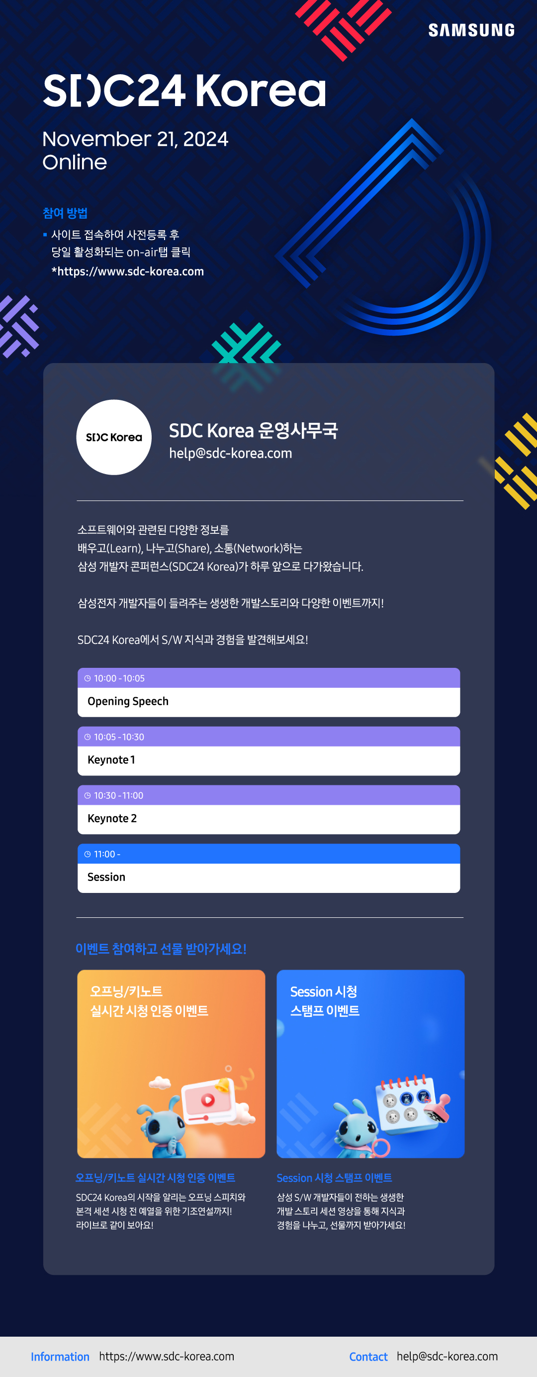 하는 삼성 개발자 콘퍼런스(SDC24 Korea)가 내일 11월 21일(목) 온라인으로 개최됩니다.