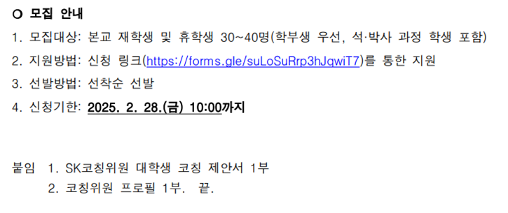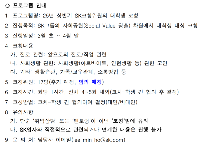 SK아너스라운지 2025년 상반기 「SK코칭위원의 대학생 코칭」에 대해 아래와 같이 안내하니, 관심 있는 학생들의 많은 참여 신청 바랍니다.
