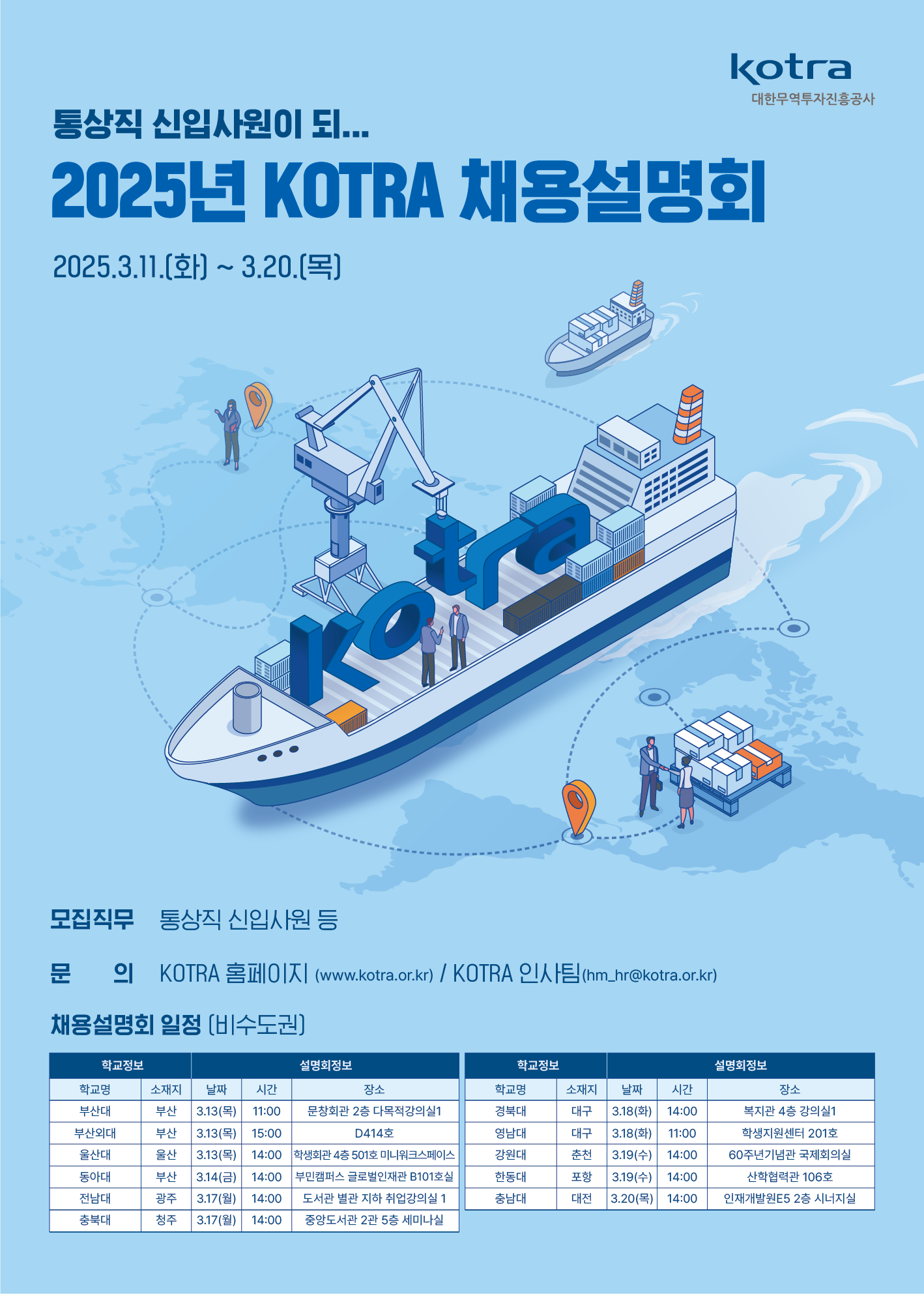 대한무역투자진흥공사(KOTRA) 2025 상반기 채용설명회 일정을 아래와 같이 알려드리니, 관심 있는 분들의 많은 참여 바랍니다.