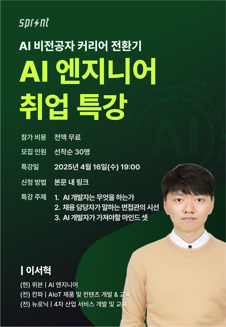 특강 참여 후, 스프린트 AI 엔지니어 부트캠프에 지원 하시면 서류 가산점을 드립니다.