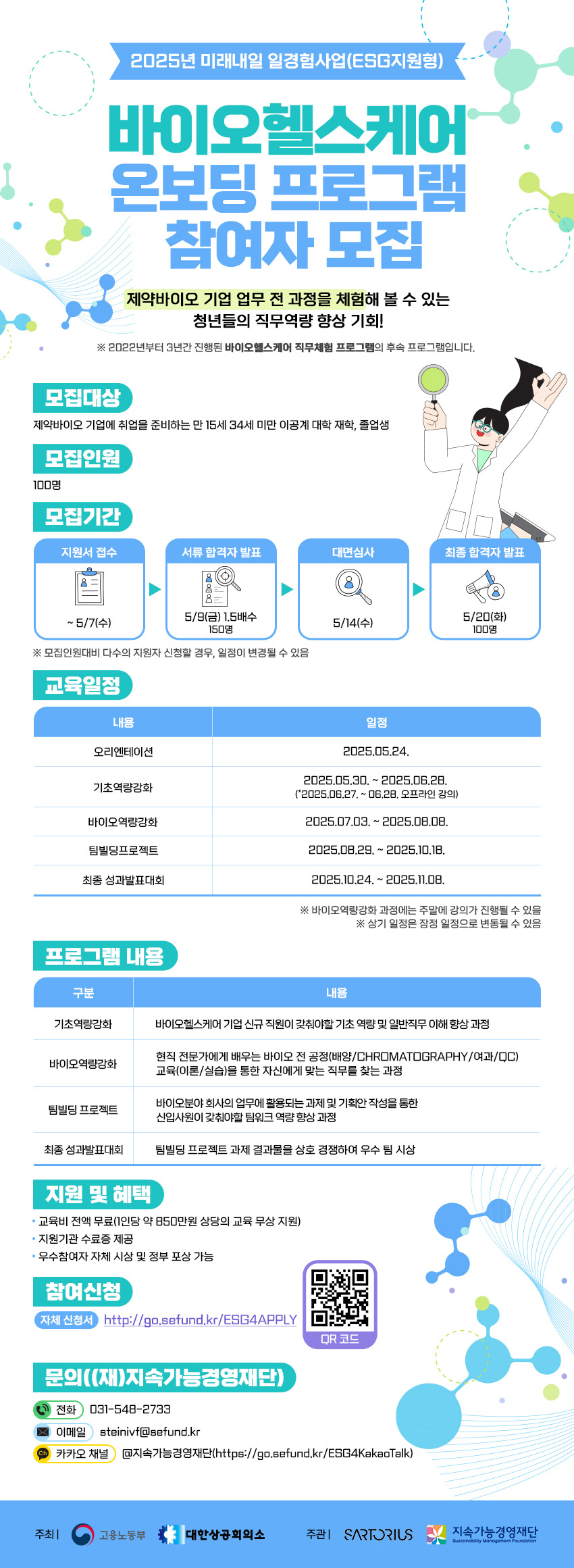「2025년 미래내일 일경험사업(ESG 지원형)」 ‘바이오헬스케어 온보딩 프로그램’참여자 모집 공고문