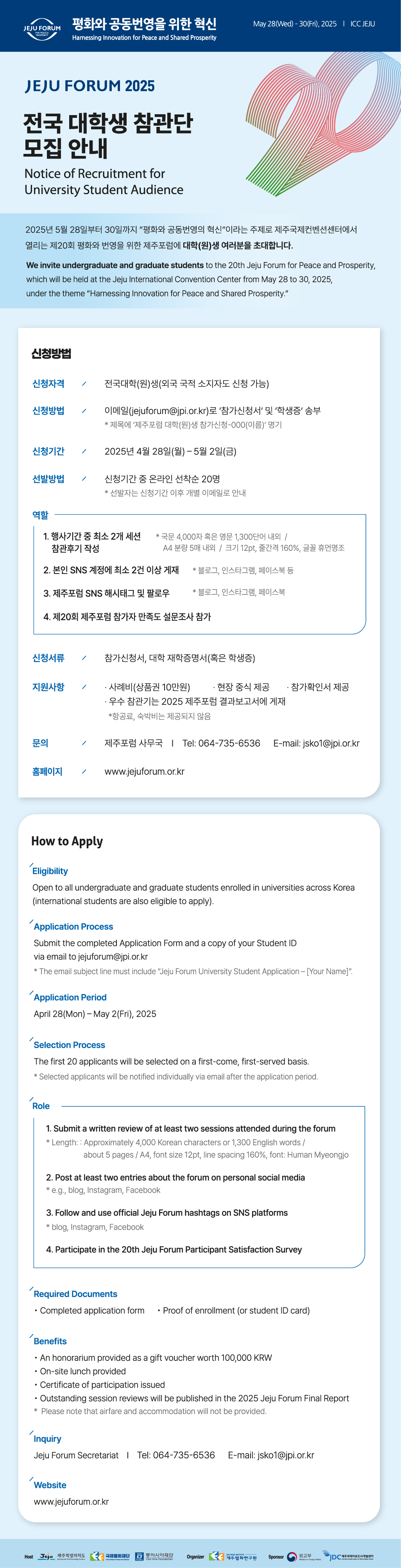 · 이메일(jejuforum@jpi.or.kr)로 ‘참가신청서’ 및 ‘대학 재학증명서’(혹은 학생증) 송부