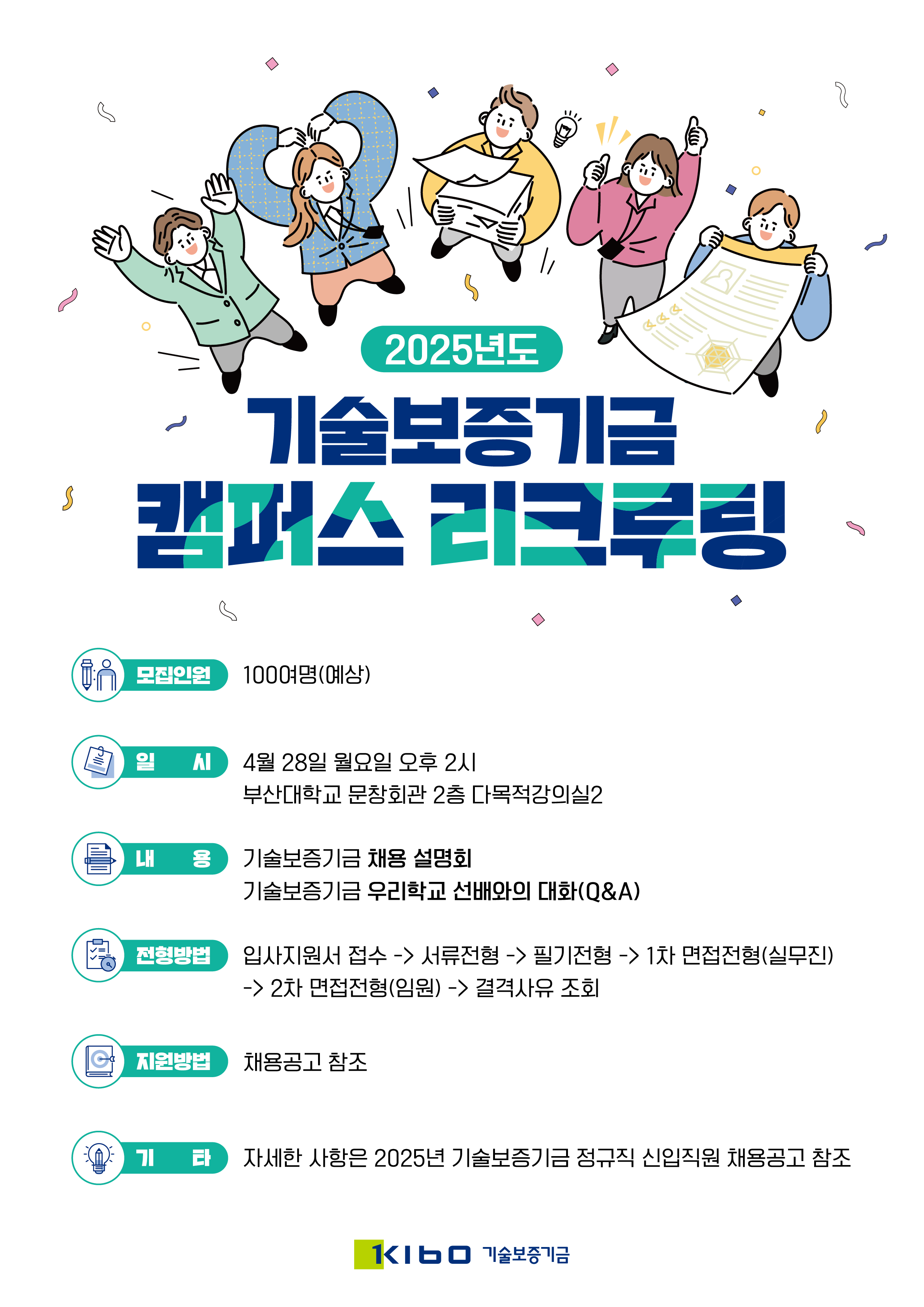 기술보증기금 2025년도 채용설명회 일정을 아래와 같이 알려드리니, 관심 있는 분들의 많은 참여 바랍니다.