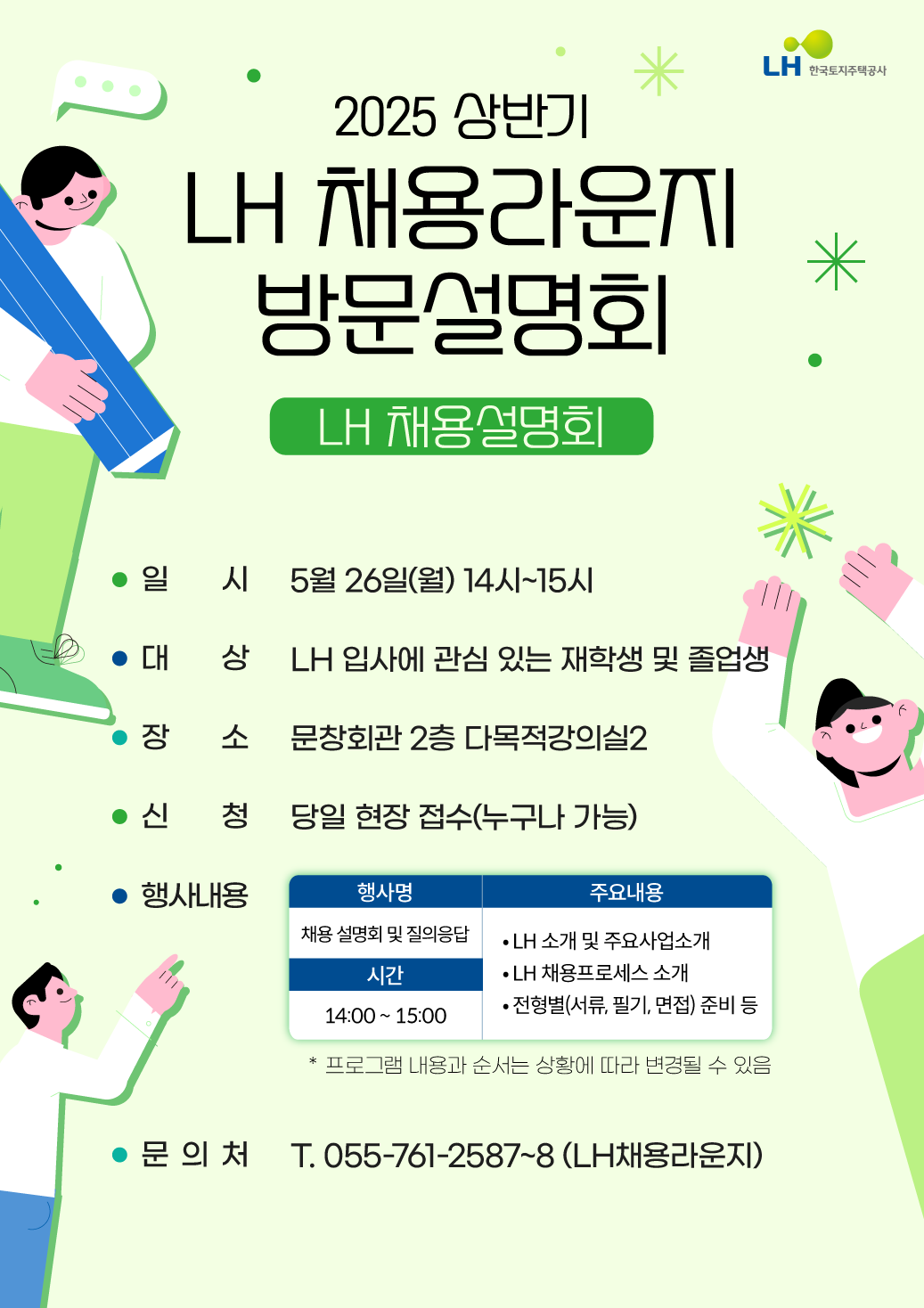LH한국토지주택공사 2025 상반기 채용설명회 일정을 아래와 같이 알려드리니, 관심 있는 분들의 많은 참여 바랍니다.