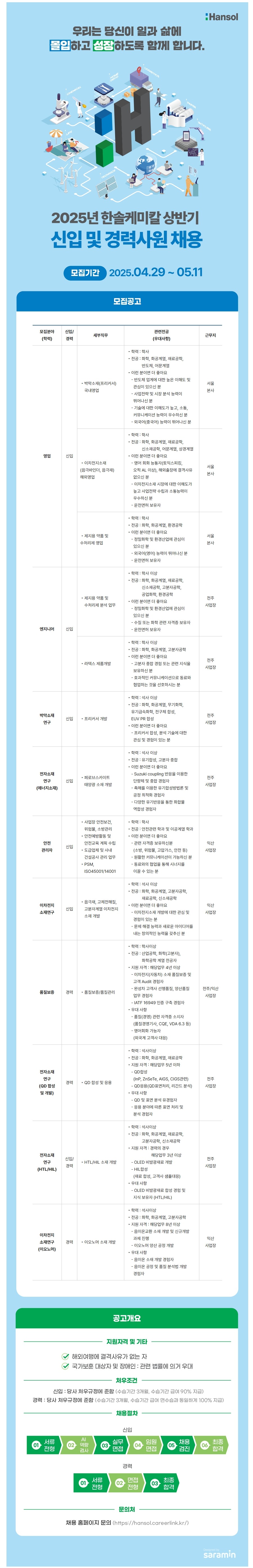 영업, 엔지니어, 박막소재 연구, 전자소재연구, 안전관리자, 이차전지 소재 연구, 품질보증