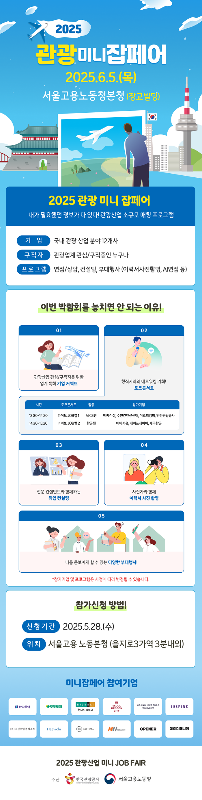6월 5일(목) 한국관광공사와 서울고용노동청이 공동 주관하는 「2025 관광 미니잡페어」가 개최됩니다.