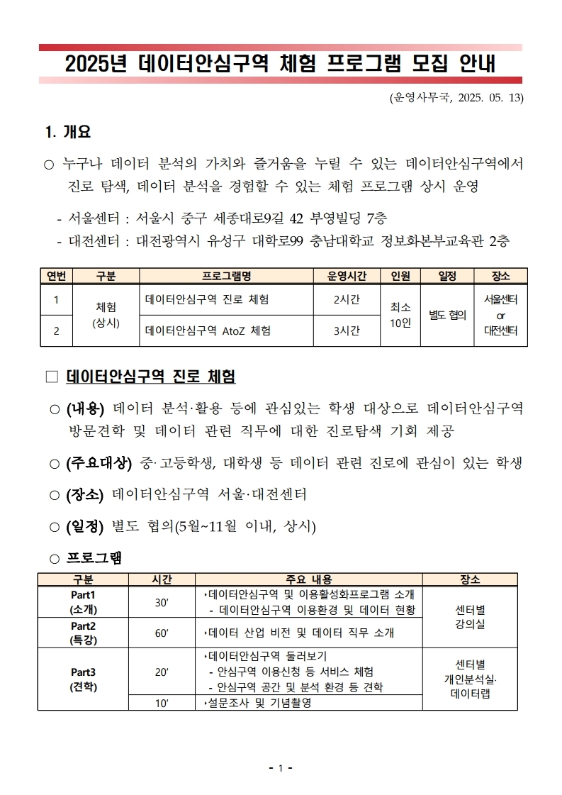 [데이터안심구역] 진로체험 프로그램 무료 지원 안내 (~5/30)