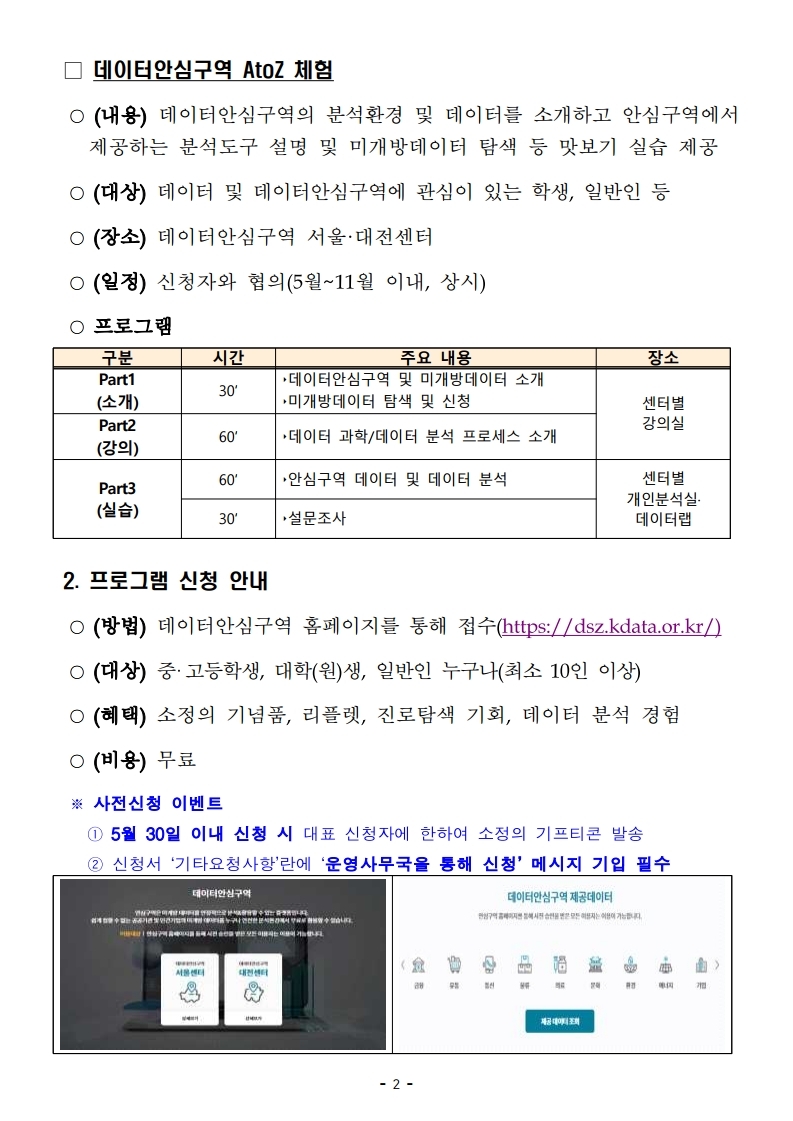 - ① 진로체험: 데이터 직무·산업 소개, 데이터안심구역 견학