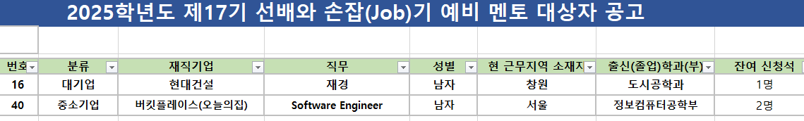 (◆2025학년도 2학기 제17기 선배와 손잡기◆) 3학년 신청가능 멘토 현황 (7.10.(목) 09:00 기준)