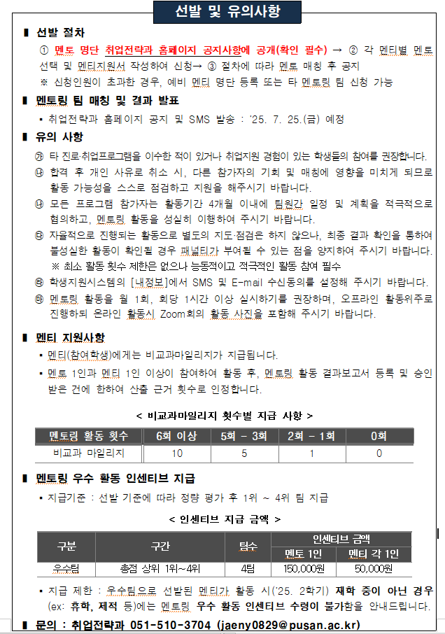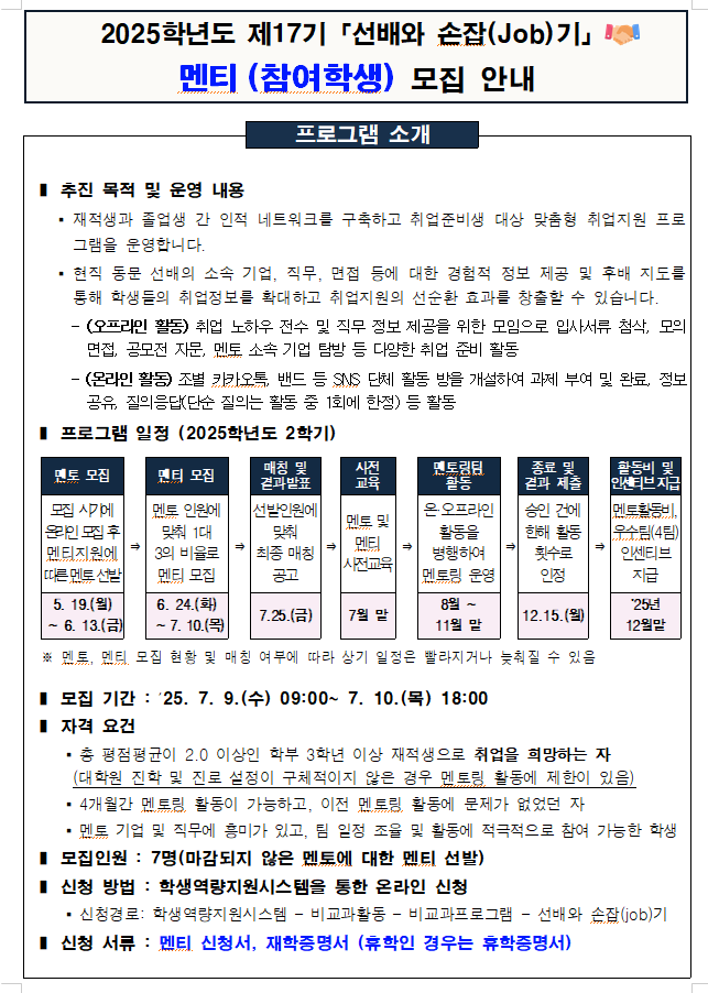 - 신청방법: 학생역량지원시스템 > 비교과 > 선배와손잡기(25.2학기) 멘티(3학년)