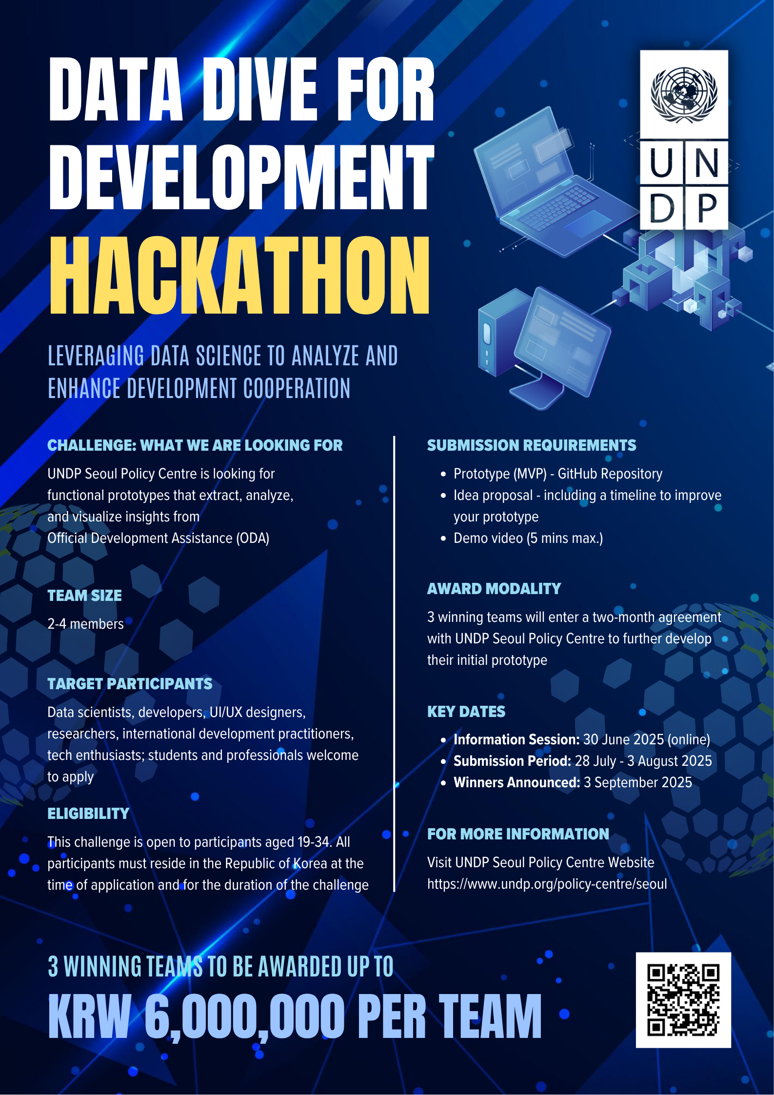 본 해커톤은 공적개발원조(ODA) 데이터를 활용하여 혁신적인 데이터 활용 도구 또는 프로토타입을 개발하고, 이를 통해 유의미한 인사이트 도출하는 것을 목표로 하는 특별한 데이터 활용 해커톤입니다. UNDP 서울정책센터는 우수한 결과물을 제출한 3개의 우승팀을 선정하여, 초기 프로토타임을 고도화할 수 있도록 2개월간의 상호협약을 체결할 예정입니다.