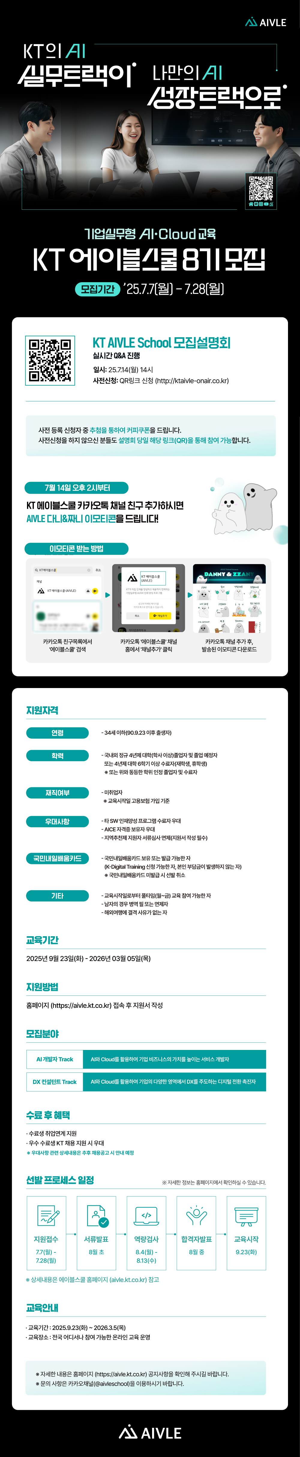 ※ 문의 사항은 링크트리(https://linktr.ee/kt_aivle) 내 오픈카카오톡(KT 에이블스쿨 8기 모집 Talk)을 이용하시기 바랍니다.