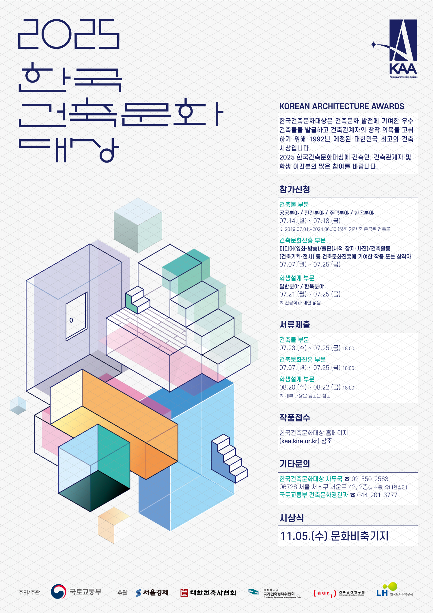 ※ 자세한 공모 요강 및 제출 양식은 한국건축문화대상 누리집 http://kaa.kira.or.kr/ 에서 확인하실 수 있습니다.