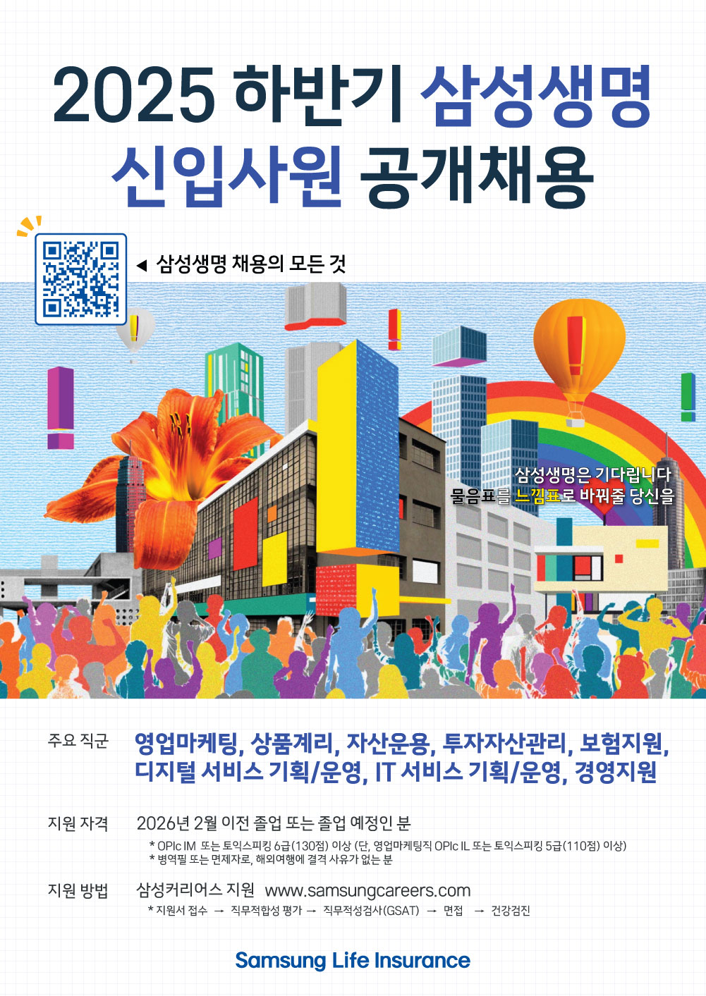 삼성생명 2025년도 하반기 채용상담회 일정을 아래와 같이 안내하오니, 관심있는 분들의 많은 참여 바랍니다.
