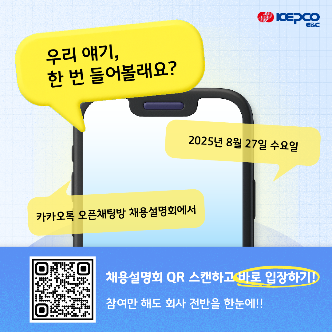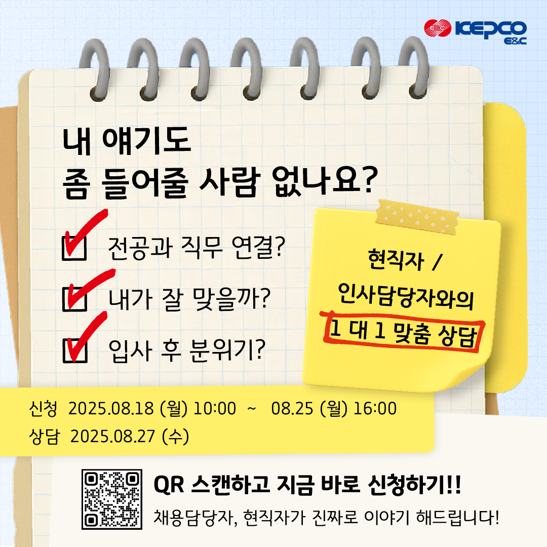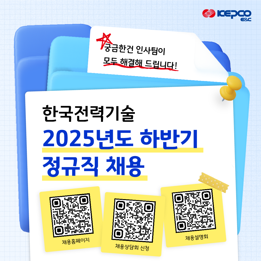 ▩한국전력기술에서 2025년도 하반기 정규직 채용을 앞두고, 지원자분들의 이해를 돕기 위해 채용설명회와 1:1 상담회를 진행합니다.