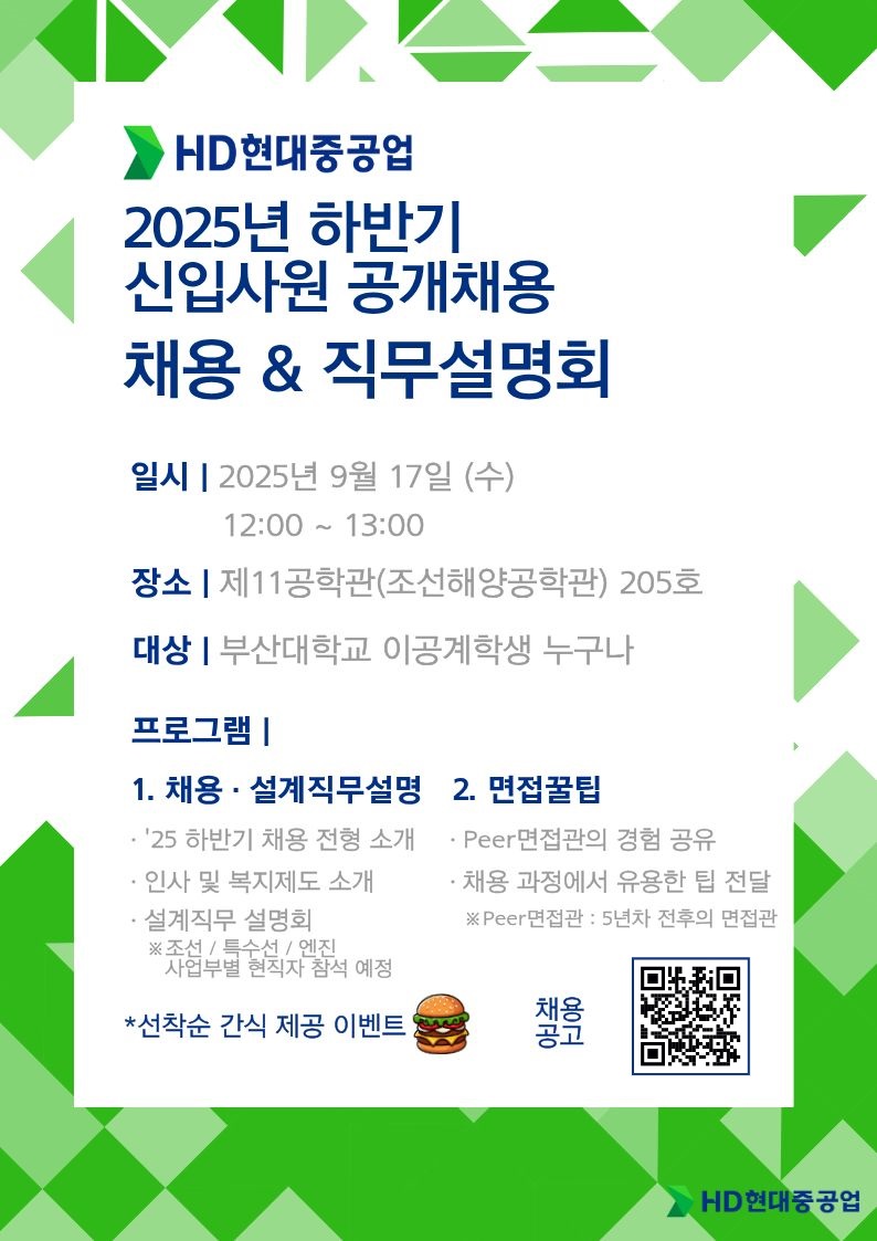 HD현대중공업 2025년도 하반기 채용설명회 및 모의면접 일정을 아래와 같이 안내하오니,