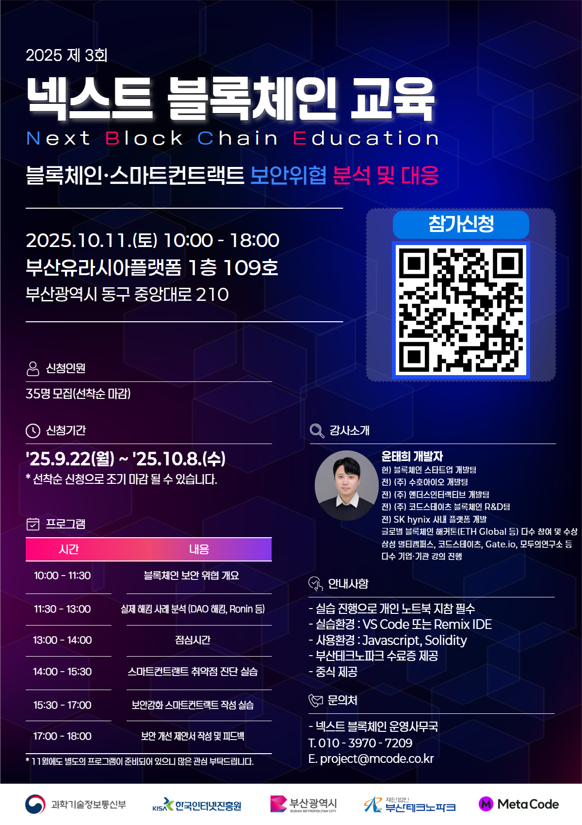 이번 과정은 블록체인·스마트컨트랙트 보안 위협 분석 및 대응을 주제로, 실습을 통해 직접 취약점을 진단하고 보완하는 경험을 할 수 있는 심화형 교육입니다.