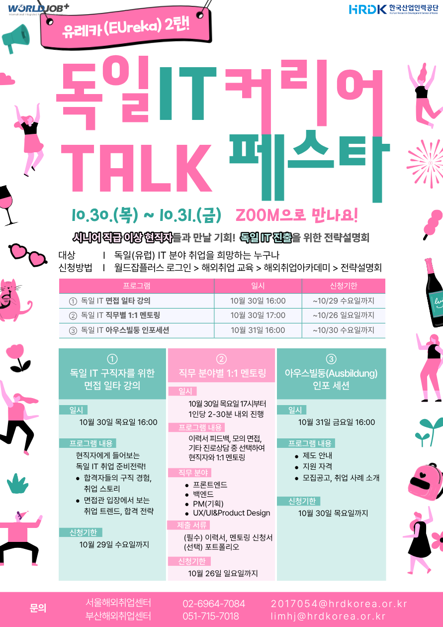「2025년 독일 IT 직종 취업전략설명회」개최 작성자관리자 작성일자2025-10-14 16:44:46 조회41 첨부파일 (373.25KB)「2025년 독일 IT 직종 취업전략설명회」개최 알림.hwp 2025년 독일 IT 직종 취업전략설명회 개최 알림.pdf