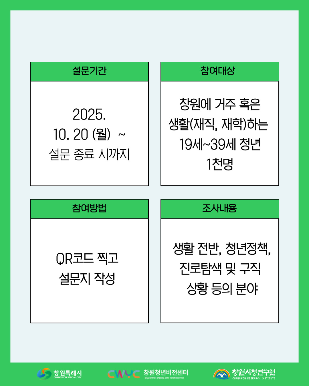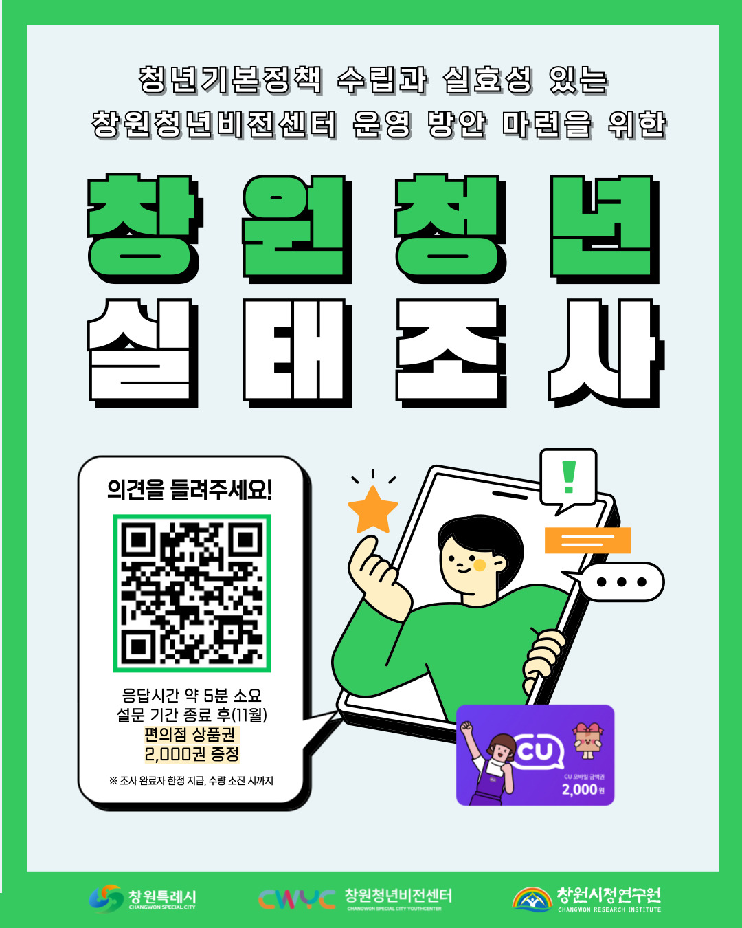 창원 청년들을 위한 조사이니 바쁘시더라도 시간 내어 응답해주시면 감사하겠습니다.