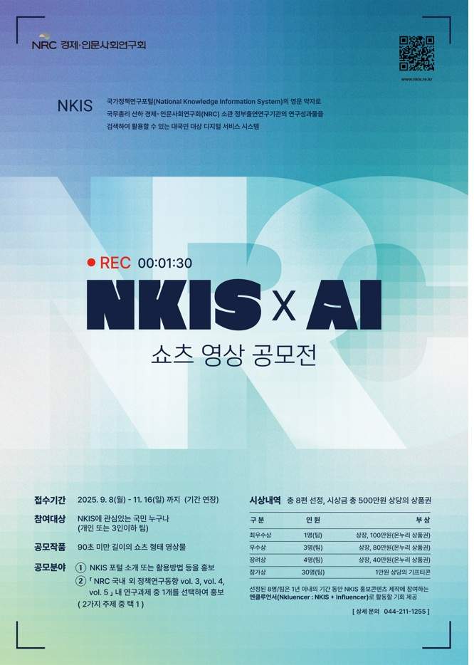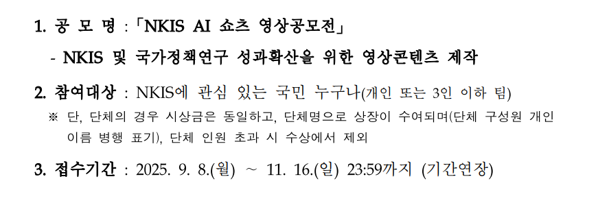 경제·인문사회연구회 「NKIS AI 쇼츠 영상공모전」 홍보 작성자관리자 작성일자2025-11-05 14:17:07 조회29 * 자세한 내용은 첨부파일 참고 바랍니다. 첨부파일 (424.36KB)NKIS AI 쇼츠 영상공모전 홍보자료.zip (414.88KB)공고문 및 첨부서류(기간 연장).zip