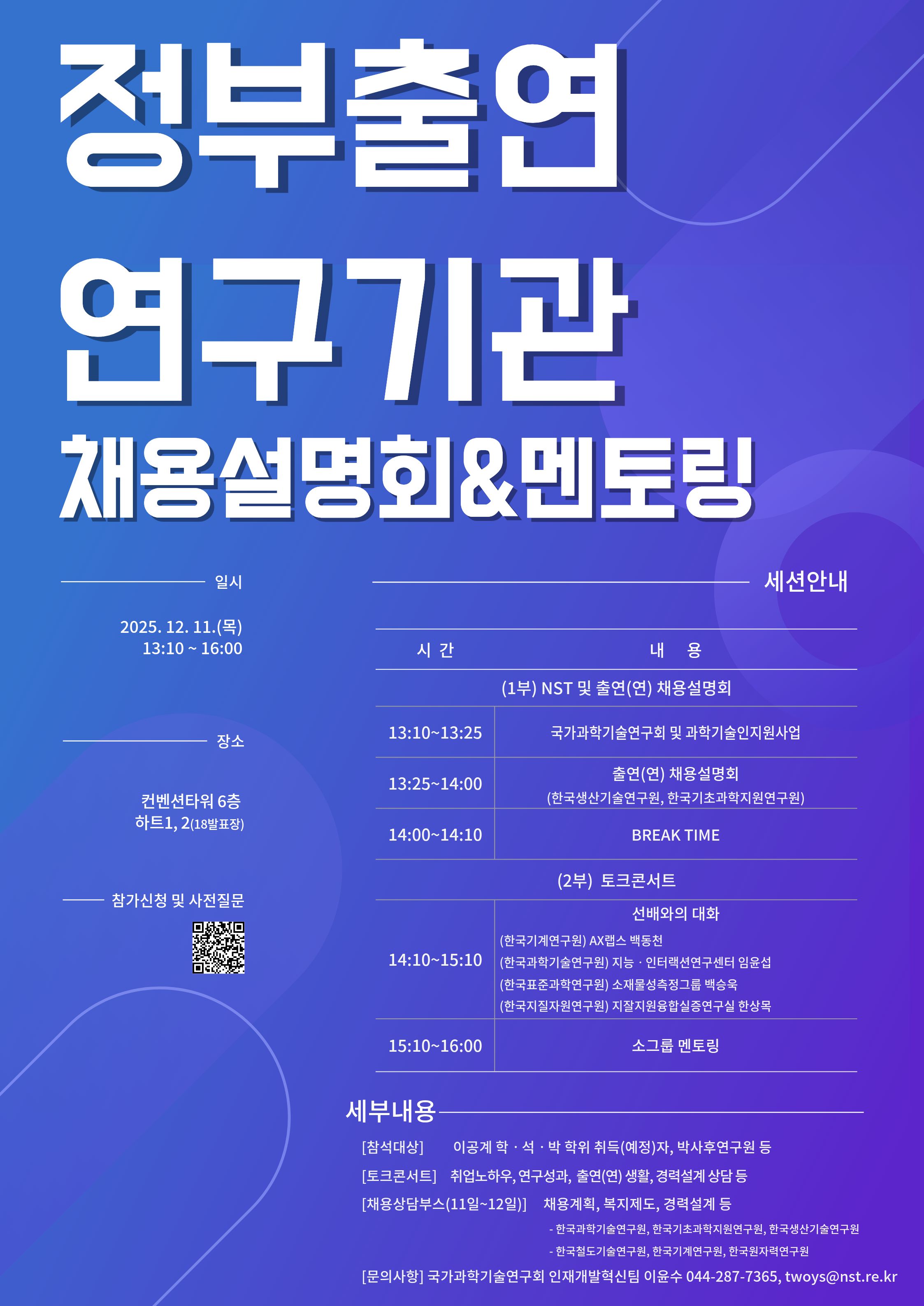과학기술분야 정부출연연구기관 채용설명회 (12.11(목)~12.(금))
