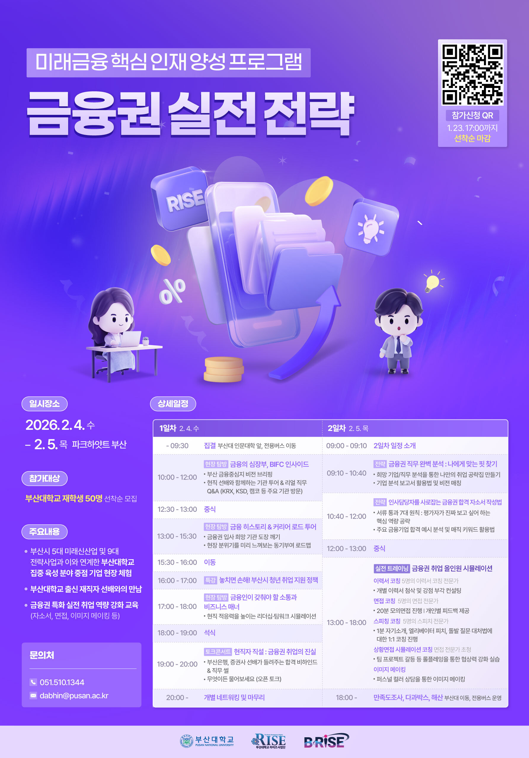 [RISE] '미래금융 핵심 인재 양성 프로그램_ 금융권 실전 전략' 프로그램 안내 작성자관리자 작성일자2026-01-19 09:44:59 조회15 첨부파일 (890.88KB)[RISE] '미래금융 핵심 인재 양성 프로그램 금융권 실전 전략’ 프로그램 안내문.hwp