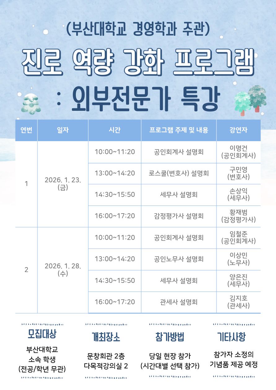 (경영학과 주관) 진로 역량 강화 프로그램 : 외부 전문가 특강 안내 (1/23, 1/28)
