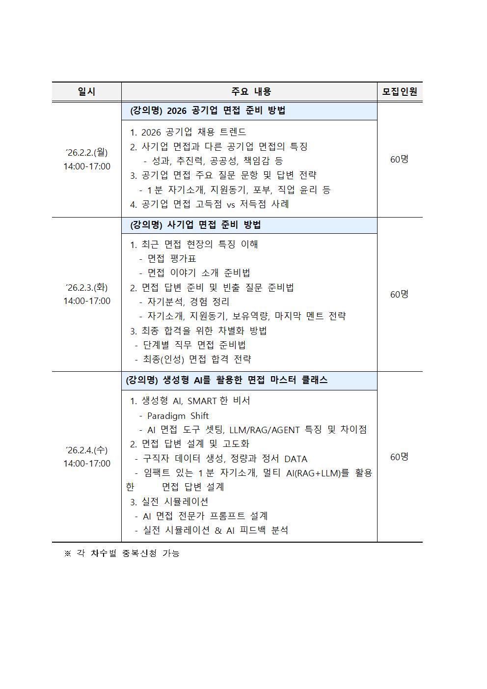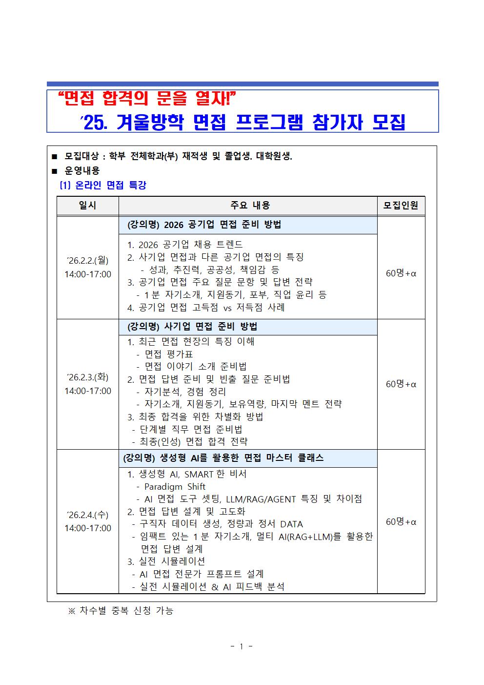 1. 온라인 면접 특강 신청 :학생지원시스템-비교과-면접 프로그램 (1차~3차)