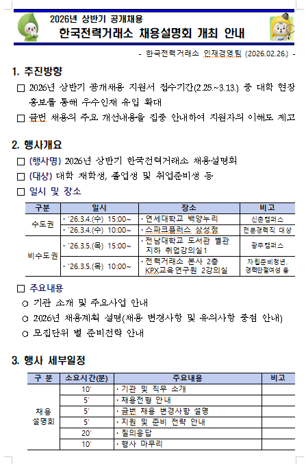 한국전력거래소 채용설명회 개최 안내 작성자관리자 작성일자2026-03-03 09:59:53 조회289 첨부파일 (422.40KB)1. 2026년 상반기 공개채용 채용설명회 개최 안내 (2).hwp