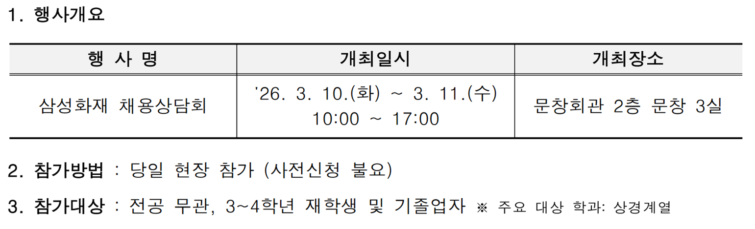 [삼성화재] 채용상담회 일정 안내 (3/10~3/11) 작성자관리자 작성일자2026-03-04 11:00:24 조회118 삼성화재 채용상담회 일정을 아래와 같이 안내드리니, 관심 있는 학생들의 많은 참여 바랍니다.