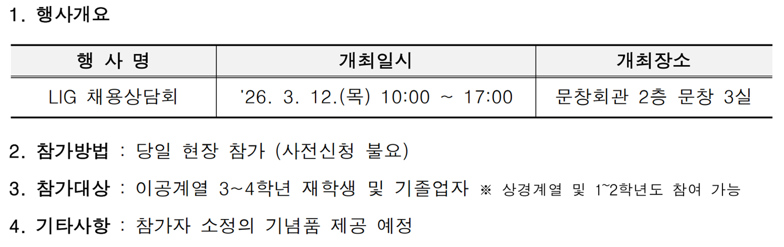[LIG] 채용상담회 일정 안내 (3/12) 작성자관리자 작성일자2026-03-04 15:45:31 조회347 LIG 채용상담회 일정을 아래와 같이 안내드리니, 관심 있는 학생들의 많은 참여 바랍니다.