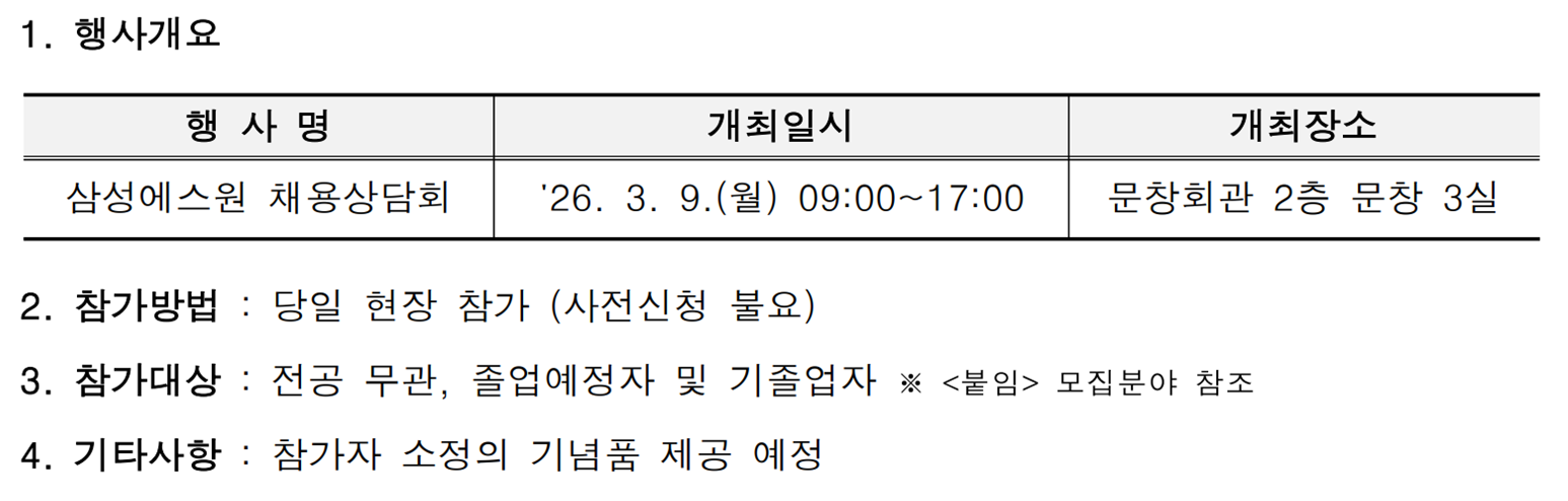 [삼성에스원] 채용상담회 일정 안내 (3/9) 작성자관리자 작성일자2026-03-04 16:55:30 조회225 삼성에스원 채용상담회 일정을 아래와 같이 안내드리니, 관심 있는 학생들의 많은 참여 바랍니다. 첨부파일 [삼성에스원] 2026년 상반기 채용 홍보 포스터.jpg