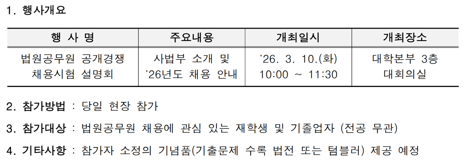 [부산지방법원] 법원공무원 공개경쟁 채용시험 설명회 일정 안내 (3/10) 작성자관리자 작성일자2026-03-04 20:52:57 조회376 법원공무원 공개경쟁 채용시험 설명회 일정을 아래와 같이 안내드리니, 관심 있는 학생들의 많은 참여 바랍니다.