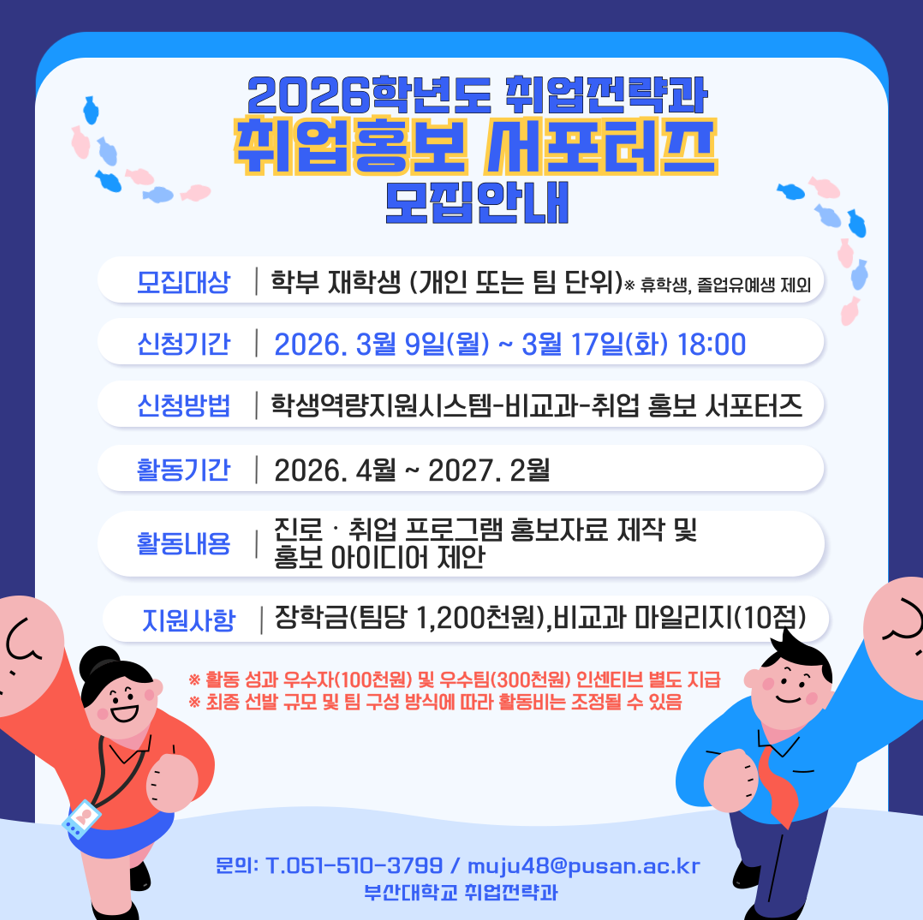 「2026학년도 취업 홍보 서포터즈」를 모집하오니 관심 있는 학생들의 많은 참여 바랍니다!