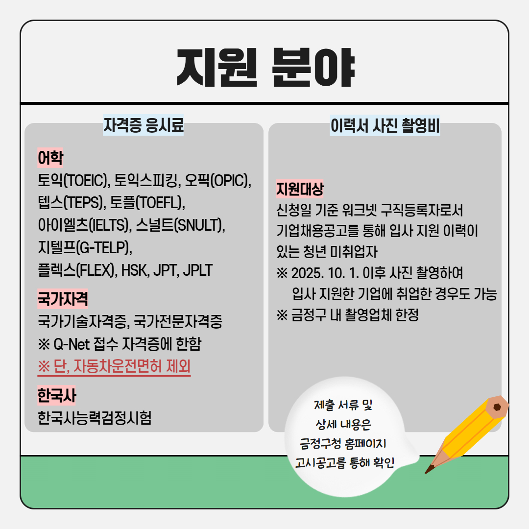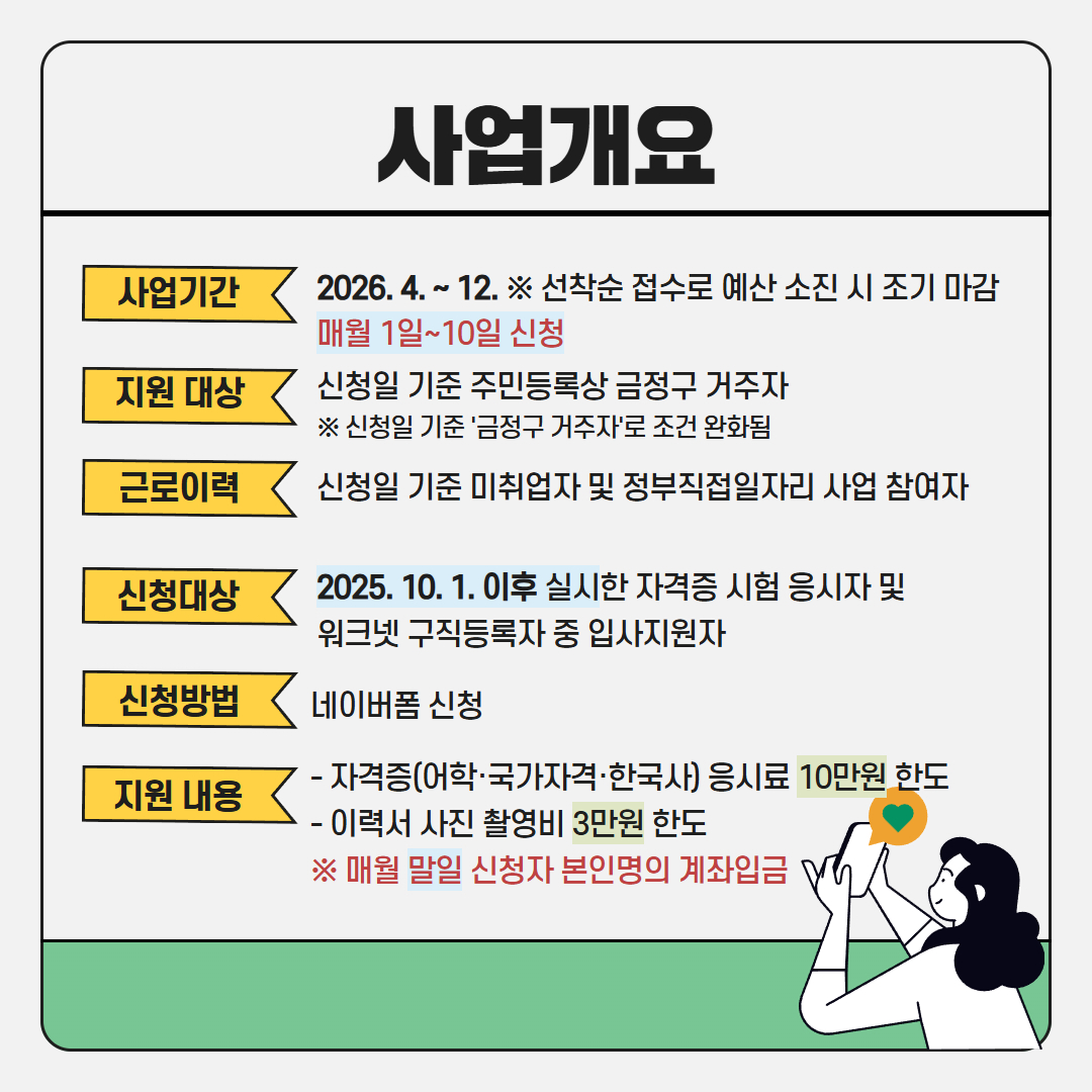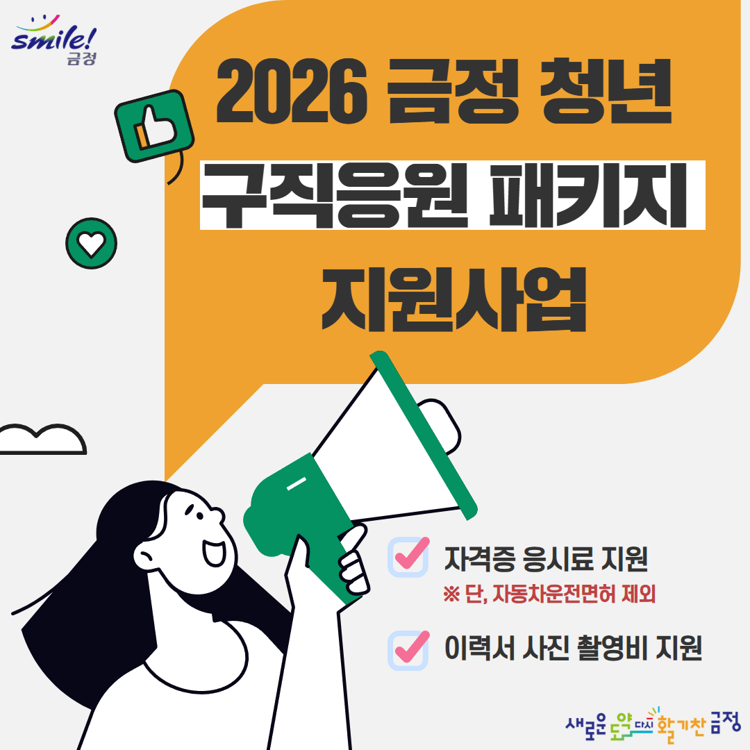 2026 금정 청년 구직응원 패키지 지원사업 모집 작성자관리자 작성일자2026-03-11 15:23:11 조회190 * 자세한 내용은 첨부파일 참고 바랍니다. 첨부파일 (67.07KB)2026 금정 청년 구직응원 패키지 지원사업 대상자 모집 공고(결재완료).hwp