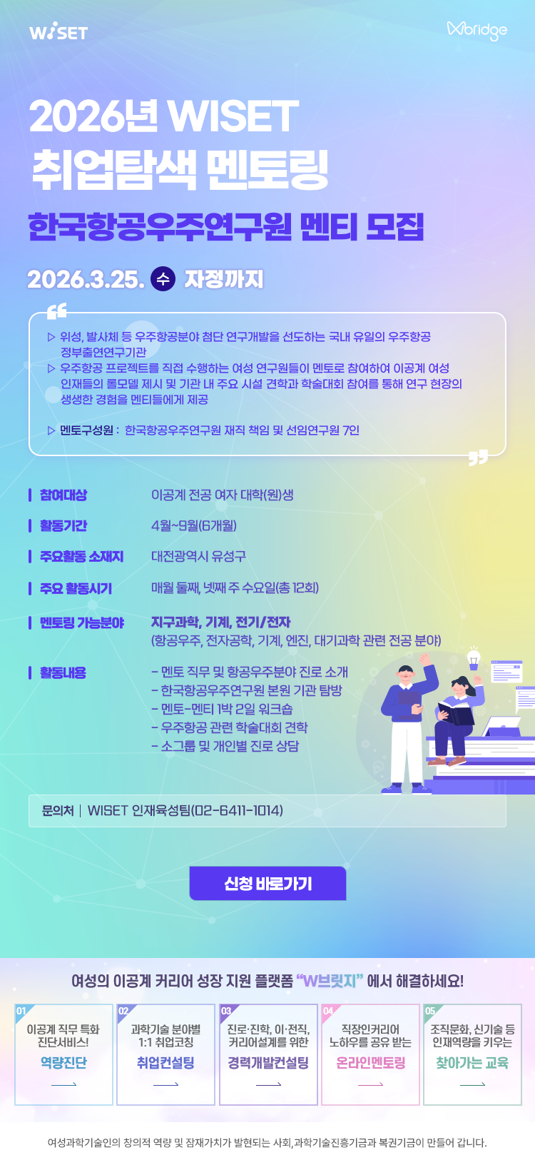 2026년 WISET 이공계 여대학(원)생 멘토링 참여자 모집 (항공우주, 지질, 에너지·자원, 기계공학, 전자공학) 작성자관리자 작성일자2026-03-11 15:27:23 조회103