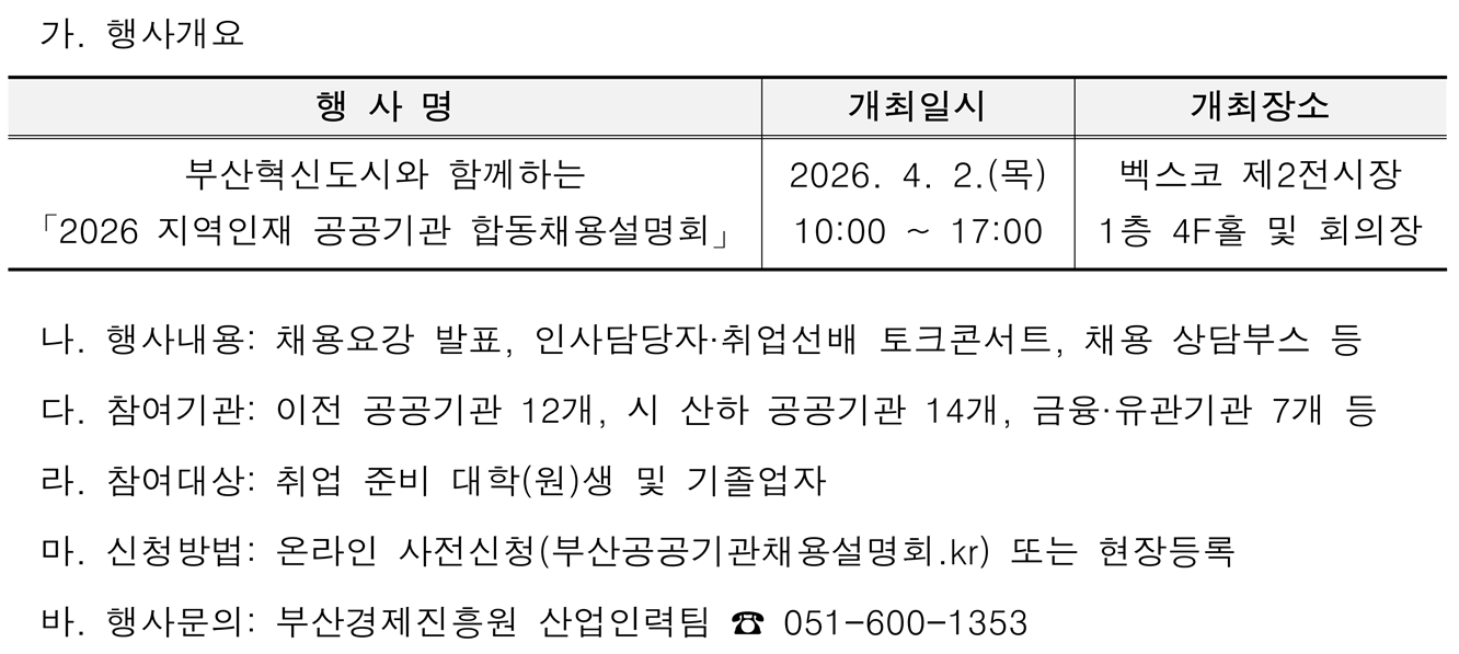 부산광역시와 부산경제진흥원에서는 지역인재 취업 지원을 위해 「2026 지역인재 공공기관 합동채용설명회」를 아래와 같이 개최할