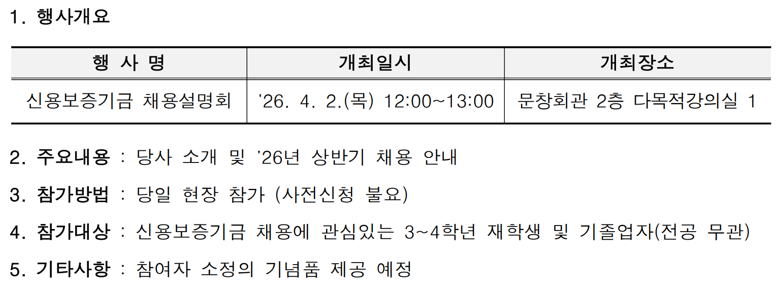[신용보증기금] 채용설명회 일정 안내 (4/2) 작성자관리자 작성일자2026-03-27 10:59:41 조회114 신용보증기금 채용설명회 일정을 아래와 같이 안내드리니, 관심 있는 학생들의 많은 참여 바랍니다.