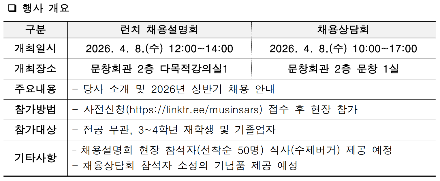 무신사리테일서비스 런치 채용설명회 및 상담회를 아래와 같이 안내드리니, 관심 있는 학생들의 많은 참여 바랍니다.
