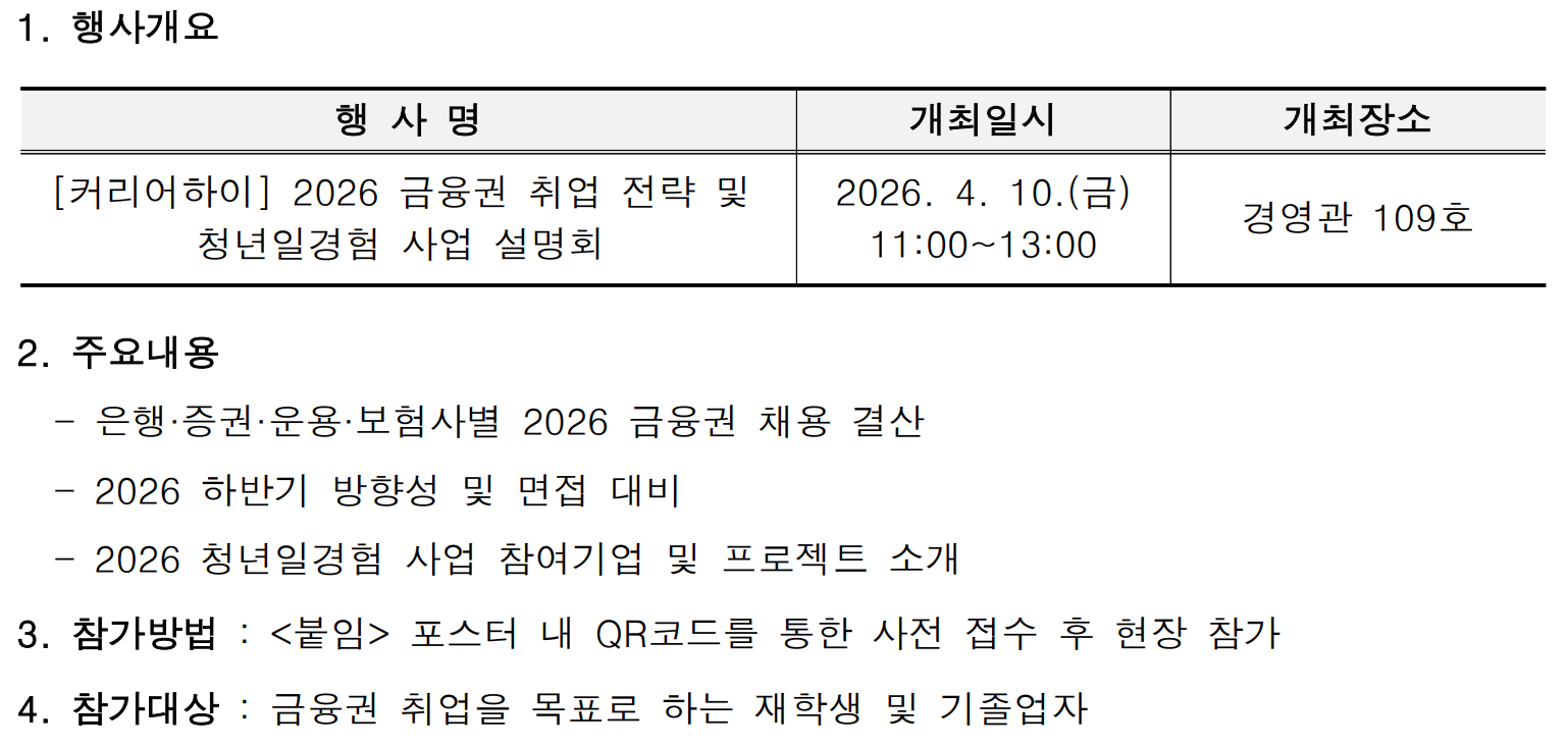 커리어하이에서 주관하는 2026 금융권 취업 전략 및 청년일경험 사업 설명회 일정을 아래와 같이 안내드리니, 관심 있는 학생들의 많은 참여 바랍니다.