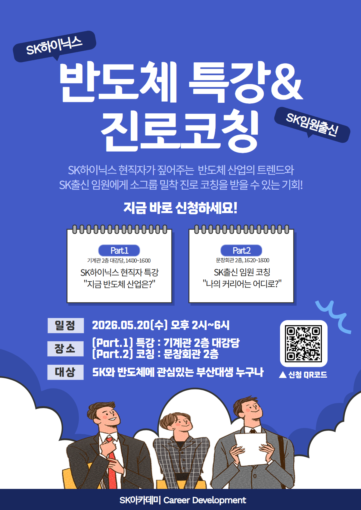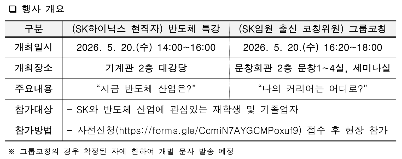 SK하이닉스 현직자의 반도체 특강 및 SK임원 출신 코칭위원의 그룹코칭 일정을 아래와 같이 알려드리니, 관심 있는 학생들의 많은 참여 바랍니다.