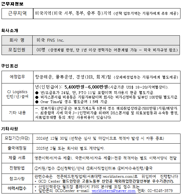 미국의 물류대기업인 FNS Inc (www.fnsusa.com) 에서 인사 담당자가 산업인력공단(월드잡)과 미국에서 직접 온라인으로 비자전문업체와 더불어 모집설명회(12월9일-수요일오전)를 진행하니 많은 참여 바랍니다. (분야별 모집 및 근무조건은 아래 참조)