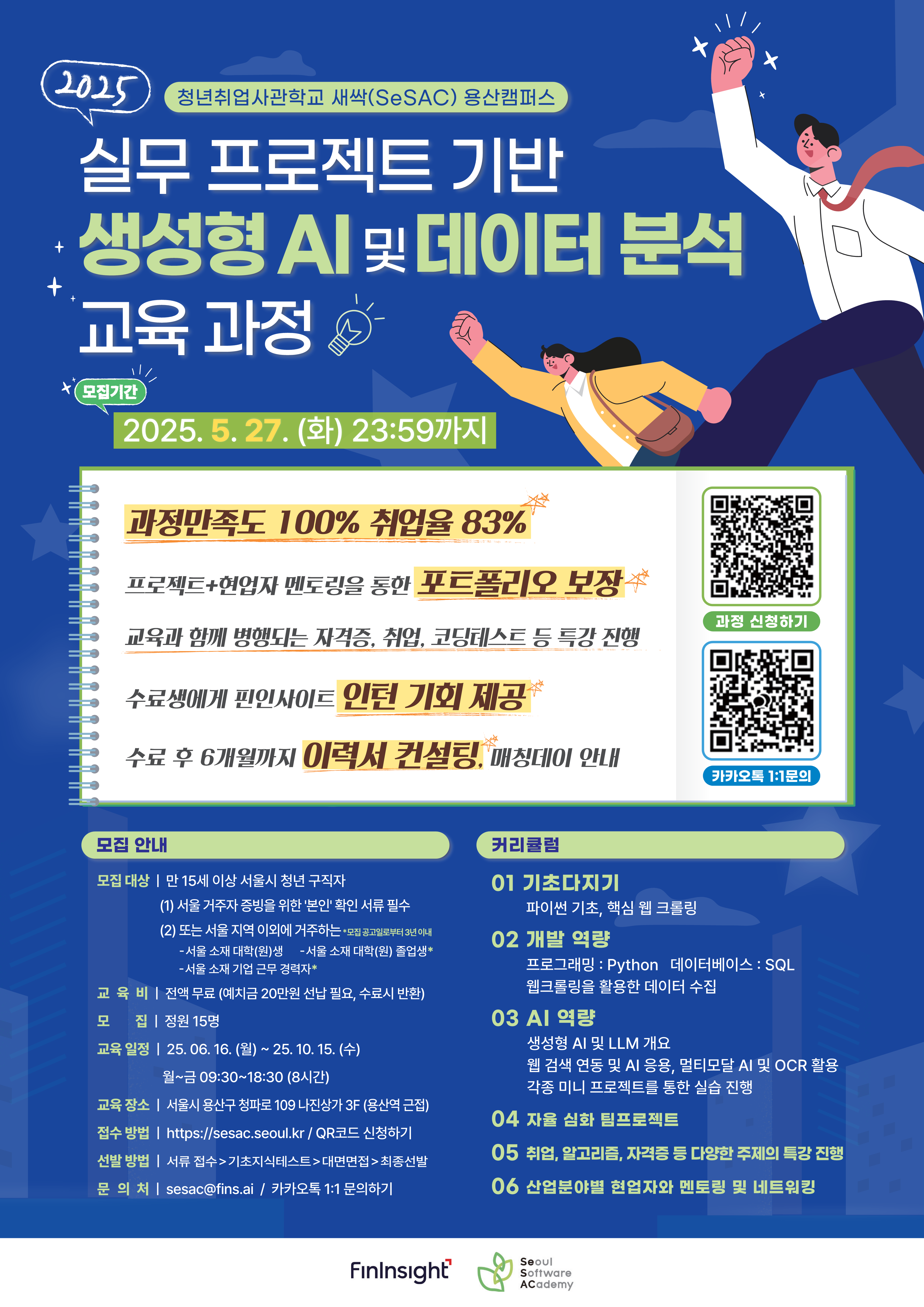 [핀인사이트] 청년취업사관학교(SeSAC) 용산캠퍼스 실무 프로젝트 기반 생성형 AI & 데이터 분석 교육 과정 교육생 모집